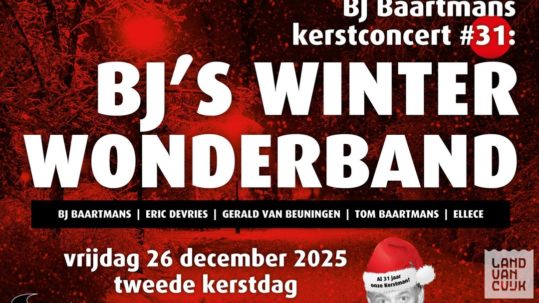 Hét kerstconcert wordt ook dit jaar natuurlijk weer verzorgd door Bart-Jan Baartmans. Voor de 31e (!) keer op rij is deze Boxmeerse snarenplukker te gast met de kerst, een traditie lijkt geboren. BJ neemt voor dit kerstconcert een speciaal samengestelde band mee: BJ’s Winter Wonderband. Editie kerst 2025. Een vijfsterrenensemble zonder drummer maar met prachtige stemmen en heel veel snaren! BJ Baartmans (zang, gitaar, mandoline, dobro), Eric Devies (zang, gitaar), Gerald van Beuningen (bas), Tom Baartmans (gitaar, bas) en Ellece (zang) brengen een repertoire waarbij ze putten uit het werk dat ze ook brengen met Hidden Agenda, Hello Goodbye Band, BJ’s Wild Verband en Ellece. Americana, pop en soulnummers van hun voorbeelden zoals The Band, Van Morrison, JJ Cale, Neil Young en Bob Dylan. Met daarnaast eigen liedjes in die geest. Het jaarlijkse BJ’s Winter Wonderband feestje in Gryphus is altijd goed voor een sfeerrijke, licht swingende en troostrijke Tweede Kerstdag.