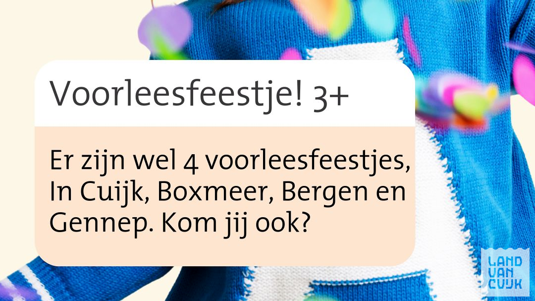 In het kader van de Nationale Voorleesdagen vieren we feest in Gennep, Cuijk, Boxmeer en Bergen! Niet zomaar een feest maar een echt voorleesfeest. Om te vieren dat voorlezen echt super leuk is!