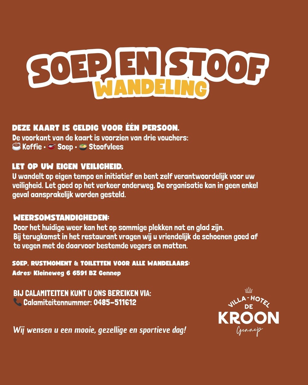 Op zondag 26 oktober kun je diverse afstanden wandelen en vooraf, tussendoor en daarna genieten van de heerlijkheden uit de keuken van De Kroon bij de Soep & Stoof wandeling. Reserveer snel!