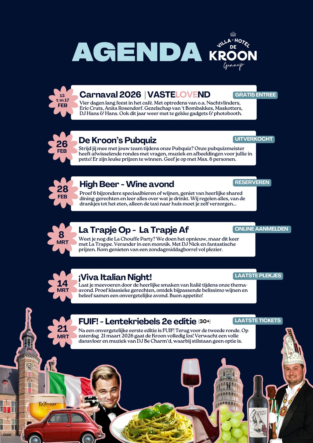 Mis geen enkel evenement bij Villa Hotel de Kroon; bekijk nu de agenda en zorg dat je bij al je favoriete events bent. Er zijn allemaal speciale dingen georganiseerd, zoals Carnaval in het café, High Wine/High Beer avond, Viva Italian Night en La Trappe Party.