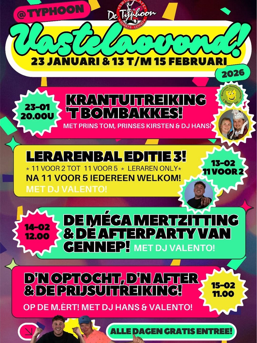 Vier jij carnaval bij Café de Typhoon? Kom feesten op het Lerarenbal, de Mertzitting, de Mega Mertzitting Afterparty en meer gezellige feestjes.